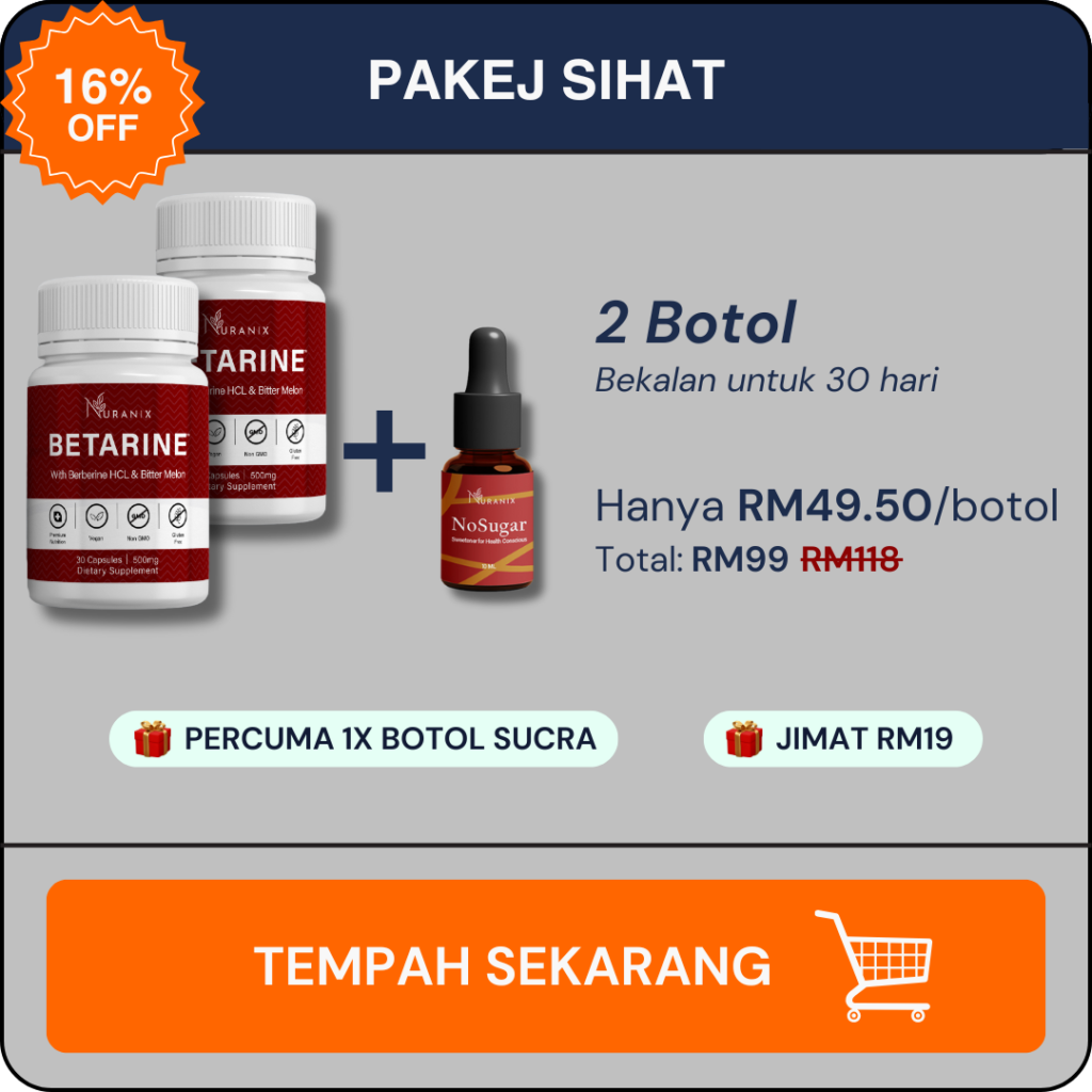 – Asiah, 54Sebelum ni check gula waktu pagi okay je, lepas je makan memang terus tinggi bacaan. Tapi sejak amal Betarine ni dia naik jugak cuma tak naik mengarut sangat macam sebelum ni la. Kalau sebelum ni, lepas sarapan tu rasa takut nak tengok bacaan gula. Sekarang Alhamdulillah la stabil je sepanjang hari!
